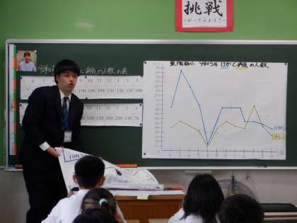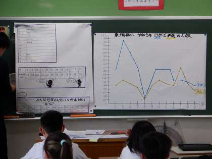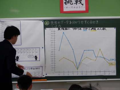 この時間は、昨年度本校でケガや病気のために保健室に行った人の月別の人数を表す折れ線グラフを分析します。