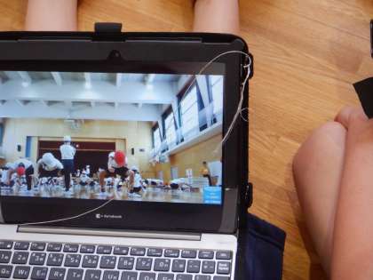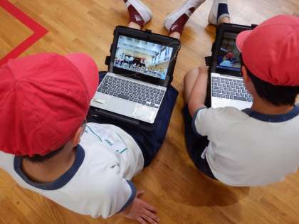 5年の団体演技の練習です。自分の演技をPCで撮影して、自分でチェックしているところです。