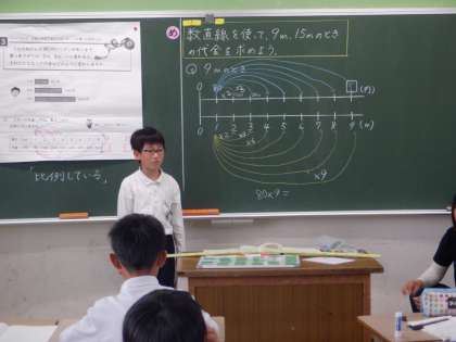 5年算数の学習です。1mが80円のリボンの長さと値段の関係をつかみます。