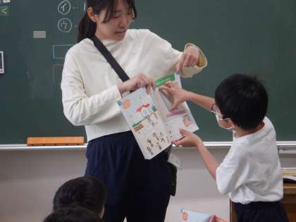 指を広げて比べる方法を見せてくれています。身近なところではこんなふうによくやりますね。
