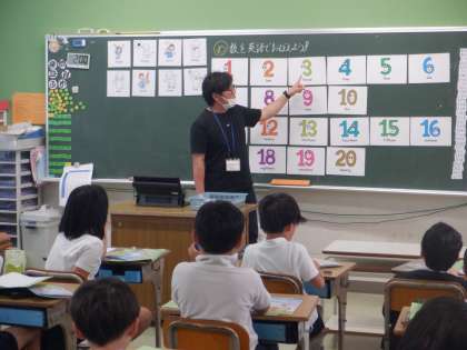 数を表す英語について、先生の後に続いて発音して覚えます。
