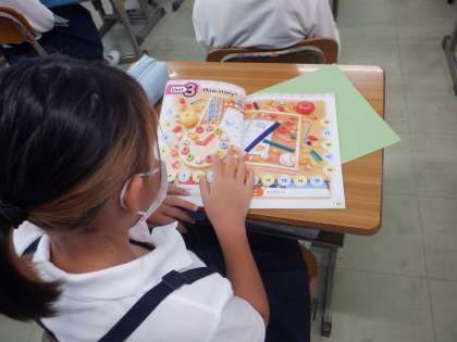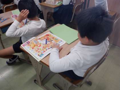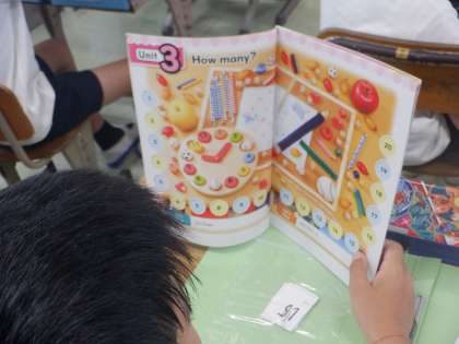この挿し絵の中に、リンゴがいくつあるかを探して、英語で答えます。