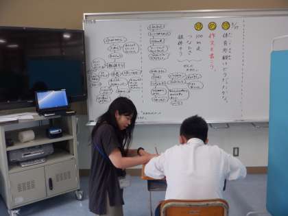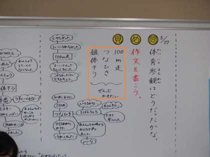 体育参観の作文を書こうとしています。「3つの種目全部について書きたい」という気持ちをもっているので、それを目標にします。