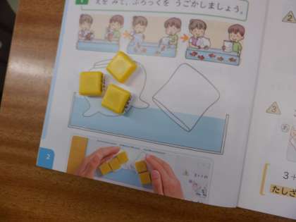 1年算数の学習です。「あわせていくつ」のたし算の学習です。金魚1匹をブロック1つとして、問題に合わせた数のブロックを並べます。