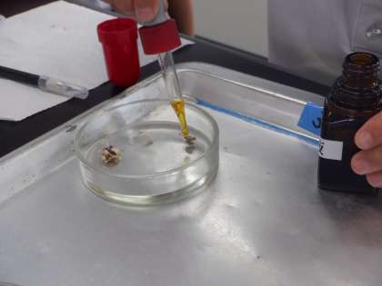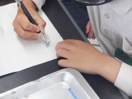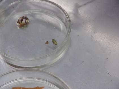発芽後しぼんでしまった子葉を切って、おなじようにヨウ素液をつけてみました。