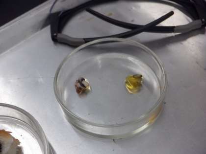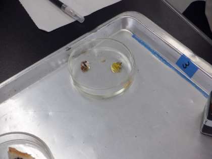 右側がしぼんだ子葉ですが、左側とちがって、青紫にはなりませんでした。でんぷんはなくなっているようです。