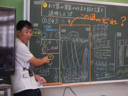 さらに、「この4(オレンジの○)は、右の図(オレンジの□)の中のどれかな」という問いかけがありました。すかさず、10が4つあるという意味の4だ と答えています。黒板のとなり同士の考えがつながってきました。