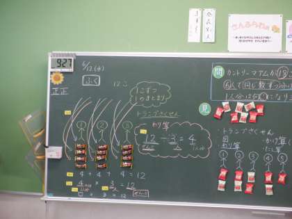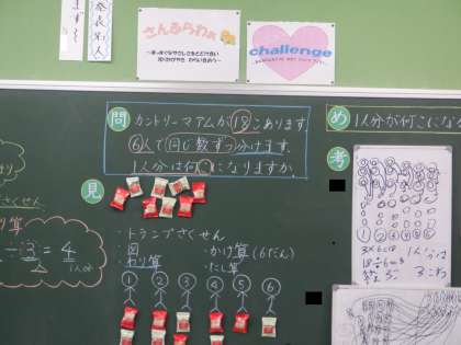 3年算数の学習です。18個のお菓子を6人に分けた時の一人分の個数を求めるのが今日の問題です。