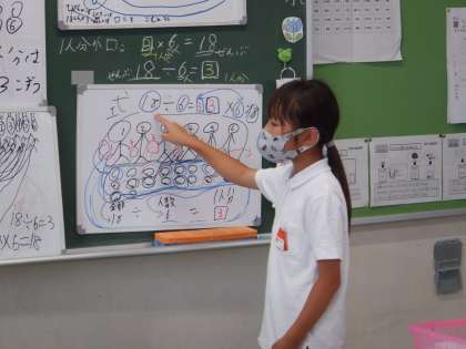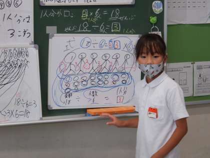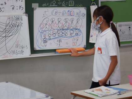 これまでのかけ算で学習した、1人分×いくつ分=全部の数 という考え方をつなげて、わり算のこの場面を説明することができました。