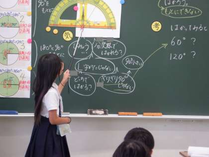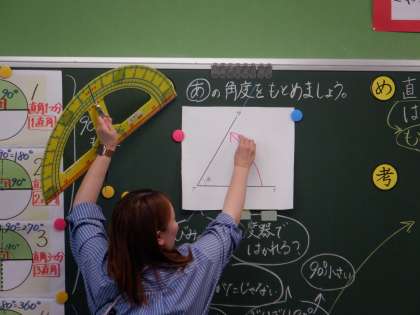 分度器の角度の読み方について説明しているところです。