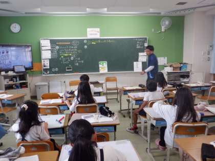 3年算数の学習です。わり算の学習をしています。前の日の問題と違って、今日は「一人分」ではなく「何人か」を求める問題です。また、お菓子などの1つずつになっているものではなく、テープという連続したものなので、図に表すのも少しむずかしいです。