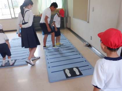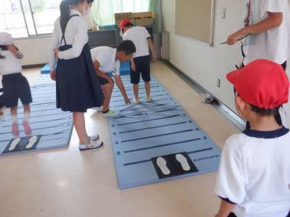 跳んだ距離を読み取って、記録している担任の先生に伝えているところです。