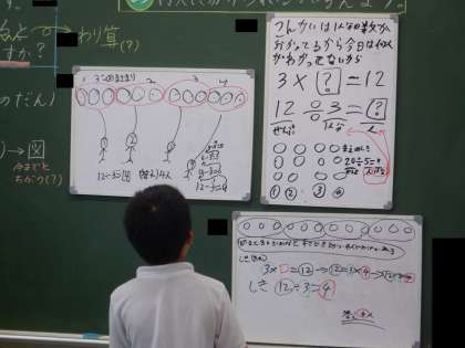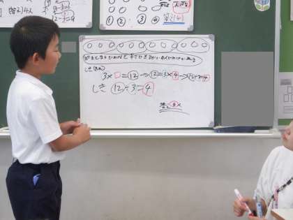 考えをみんなに伝えているところです。問題の数の関係をとらえて図や式に表し、答えを出すことができました。