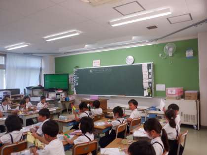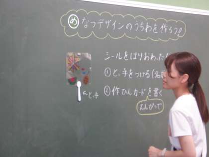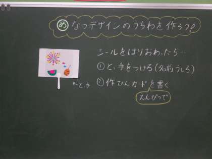 2年図工の学習です。「夏デザイン」のうちわを作っています。