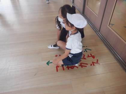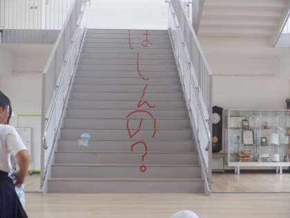 「ここにすわってかんがえよう」という文字の上に座って階段を見てみると・・・階段を走らずに歩くことを促す文字が見えます。6年生の図工の作品です。