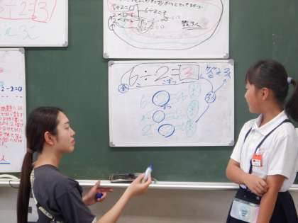 ホワイトボードに考えを書いて、みんなに伝えているところです。2個ずつわけるので、残りが0になるまで、2個を3回ひいて、ひき算で答えを出しました。