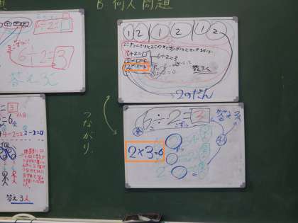 一見違った2つの考えですが、2を3回引いているので、合計は2×3=6となり、かけ算の考えに通じるところがあることを見つけていました。いい学習が進んでいます。
