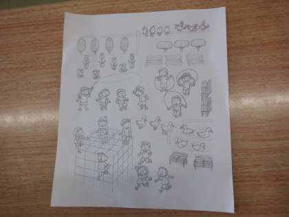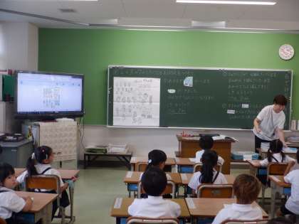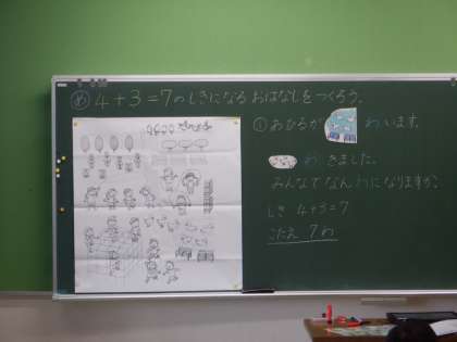 1年算数の学習です。絵の中から、4+3=7になる場面を見つけて、お話を作ります。