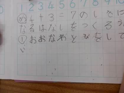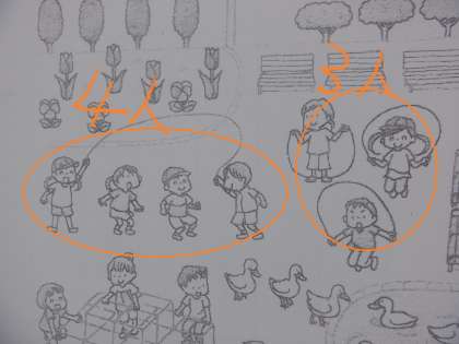 なわとびをしている人たちの場面も4+3=7です。みんなよく絵をみて、4+3=7になる場面を見つけていました。