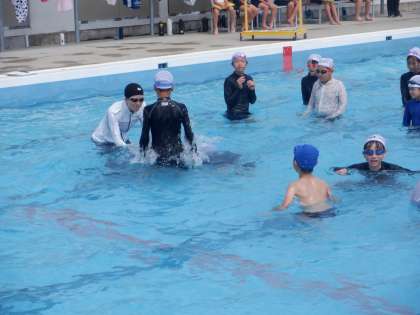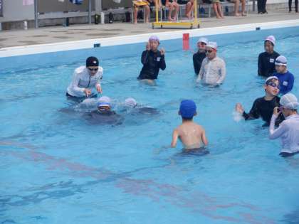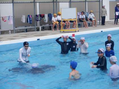 水に沈んで息を吐き、自ら出て息を吸う・・を繰り返す練習です。