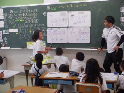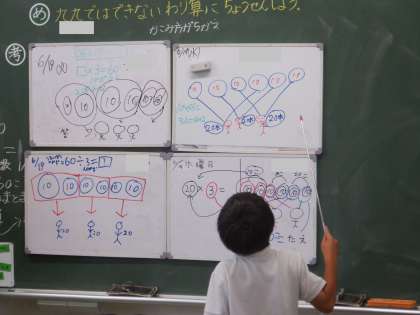 みんなの考えを交流しているところです。同じように、この場面の計算を、6÷3=2と考えることができるのではないかと気づいた人がいます。