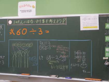 3年算数の学習です。60÷3の計算について考えています。九九の3の段は27までなので、どう計算すればよいのかが問題になっています。