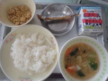 今日は、カルシウムたっぷりの「焼ししゃも」でした。ししゃもは柳の葉に形が似ていることから「柳葉魚」と書きます。骨や頭も食べられる魚です。子どもたちも骨まで食べるよう挑戦していました。