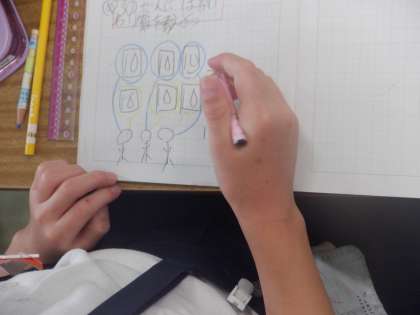 60個のお菓子を、10のまとまりを使って3人に分けることを図に表しています。