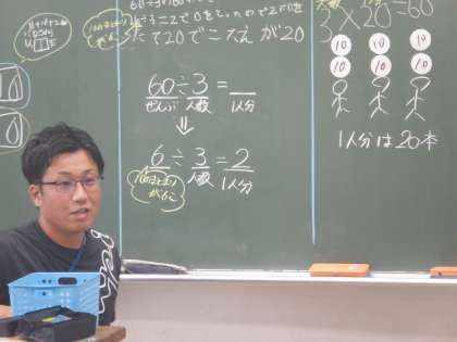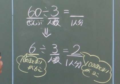 10のまとまりの数で考えると、60÷3は6÷3で考えられることに気づきました。これだと、3の段の九九が使えます。
