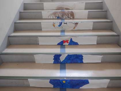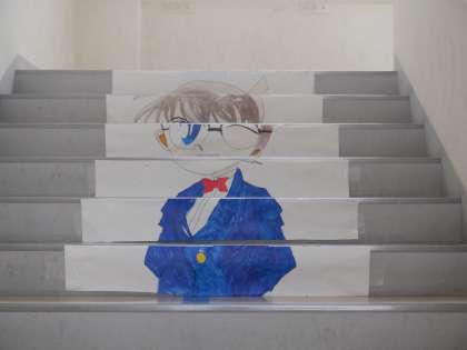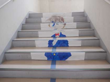 階段に絵のようなものが貼ってあるので、少し下がって見てみると・・・名探偵コナンが現れました。6年生の図工の作品です。