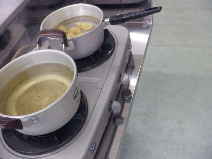 ジャガイモをゆでるために、ひたるぐらいの水を入れて強火にかけます。