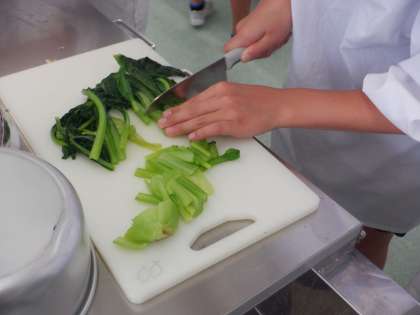 冷めた小松菜を適当な長さに切っています。集中して作業していました。