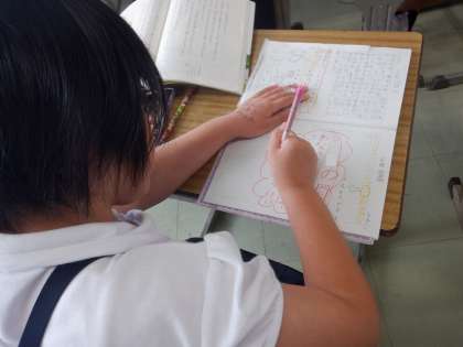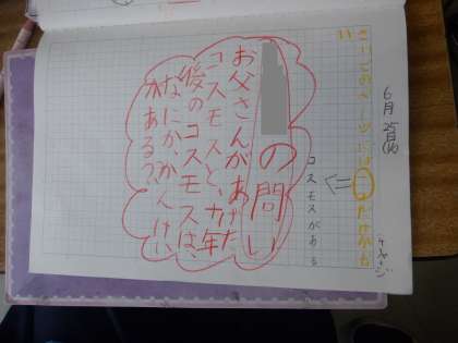 お父さんがゆみ子にあげたのは一輪のコスモスでしたが、物語の終わりには、ゆみ子の家がコスモスの花で包まれている様子が描かれています。その関係を私の問いとしました。