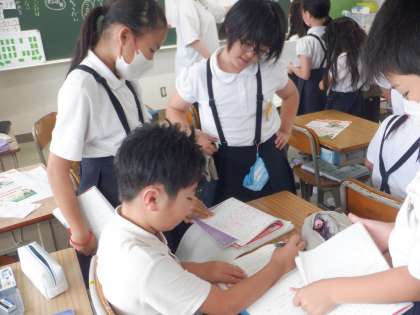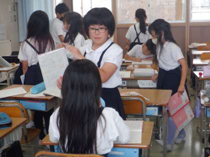 「私の問い」ができた人どうしで意見交換をしています。似たような問いを持っている人は、解決に向けて協力できるかもしれませんね。次の学習が楽しみです。
