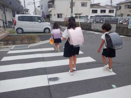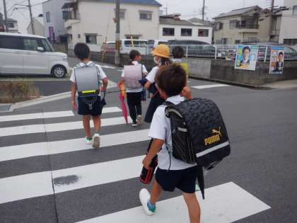 今朝の登校の様子です。曇っていますが、雨は降っていません。