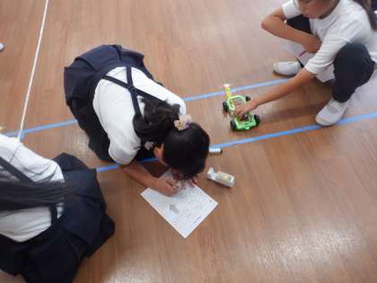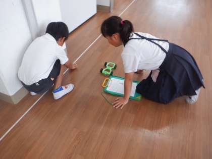実験は多目的室で行いました。ゴムを10cm伸ばしたときに車が動く距離で、動かす力を測ります。距離を測っているところです。