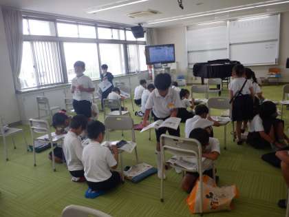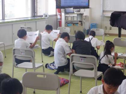 4年音楽の学習です。リコーダーで演奏する曲の楽譜に階名をつけているところです。