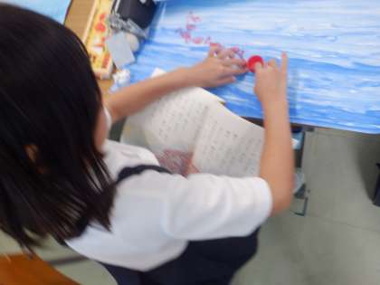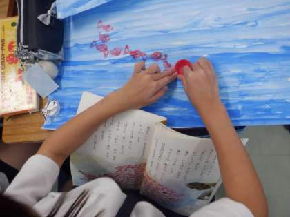 画用紙には海を表す青いえのぐがすでにぬられています。
