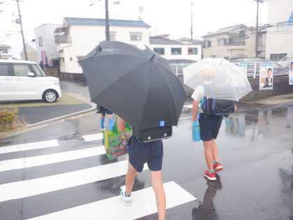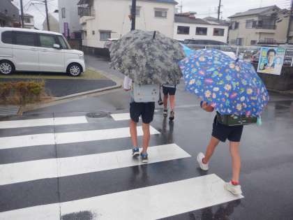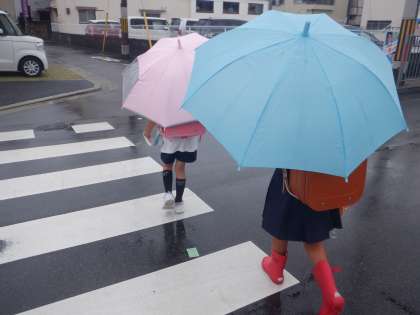 今朝の登校の様子です。雨が降っているので、傘をさしての登校です。