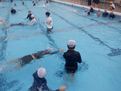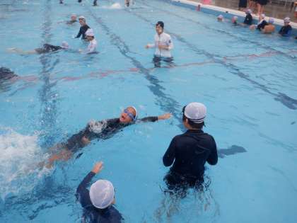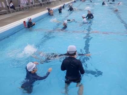 息継ぎのために顔を上げる側に立って、息ができているか、浮きの姿勢が乱れていないかをチェックしています。