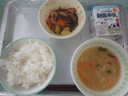 今日は、鉄分や食物繊維・カルシウムが豊富なひじきをじゃがいもと一緒に煮物にした「じゃがいもの磯煮」でした。ひじきは海藻の仲間です。スーパーでは乾燥のものが売られていますが、水につけてもどすだけで簡単に使うことができます。子どもたちの成長に必要な栄養素も豊富に含まれているので、ご家庭でも取り入れてみてくださいね。