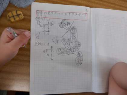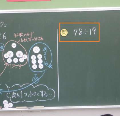 次の問題は78÷19です。商の見当のつけ方がむずかしいですね。19のいくつ分なのかを図に表して考えています。ここから、見当のつけ方を見出していきます。