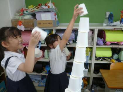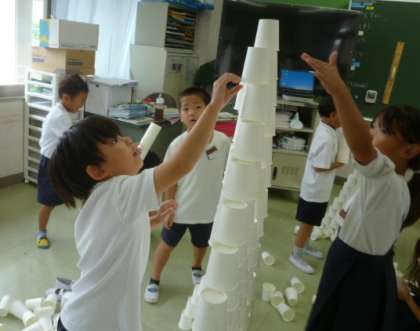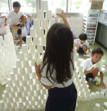 自分たちの背をこえて 高くなってきました。手をしっかり伸ばしてのせたり,土台を広くしたり・・・ちょっとしたはずみで崩れたり・・・
