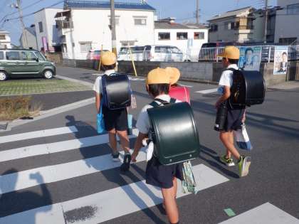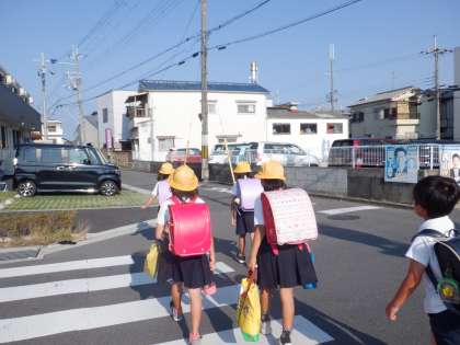 今朝の登校の様子です。時おり涼しい風が吹きますが、まだ夏の暑さが残っています。