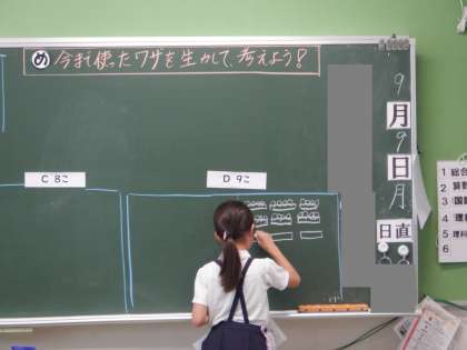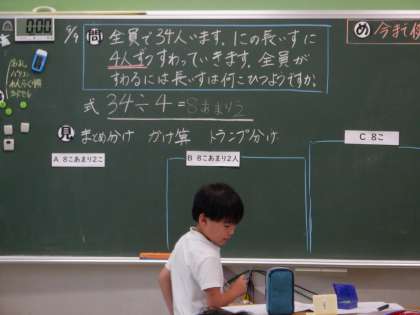 3年算数の学習です。これまでに学習したわり算の考えを生かして、問題を解きます。