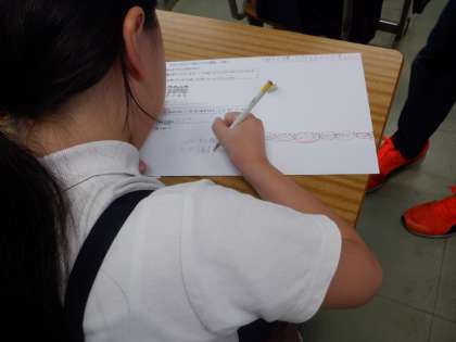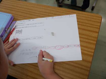 34人がみんなすわるためには、4人掛けの椅子がいくつ必要かを考えます。