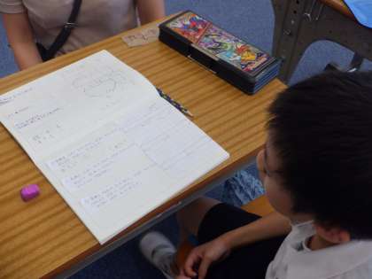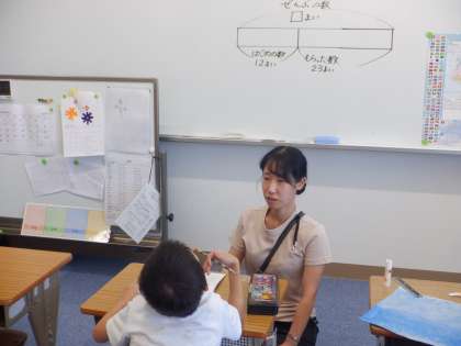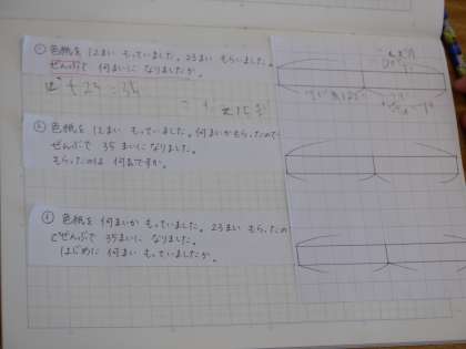 こちらでは算数の学習をしています。問題を読んで、それがたし算の場面なのかひき算の場面なのかを考えます。