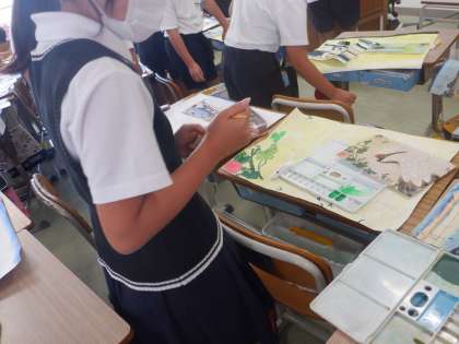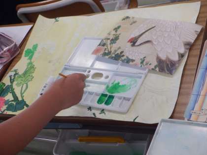 鶴の背景にあしらわれた植物の緑の濃淡をうまく表しています。