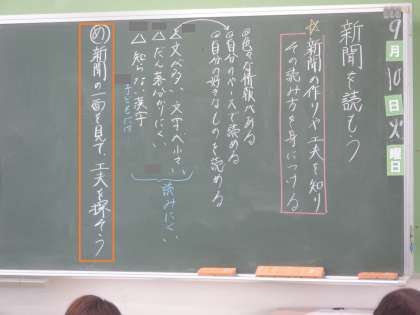 5年国語の学習です。新聞のつくりや工夫を知り、読み方を身につける学習です。この時間は、一面の工夫を探すことがめあてです。