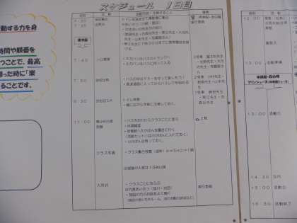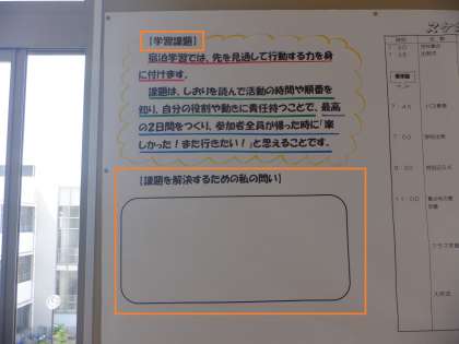 5年生のろうかには、宿泊学習のスケジュールが掲示されています。宿泊学習も「学習」であり、「先を見通して行動する力をつける」という課題があります。そして、各自が解決に向けて「私の問い」を持って取り組みます。